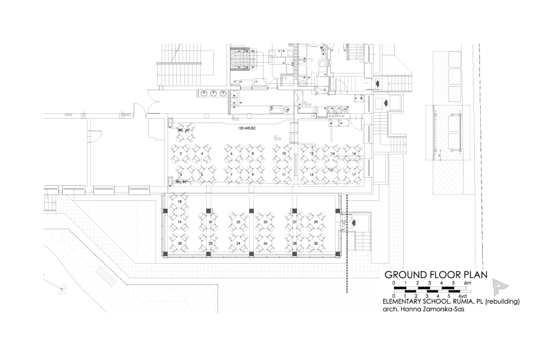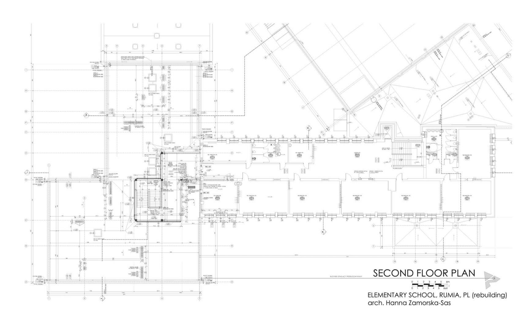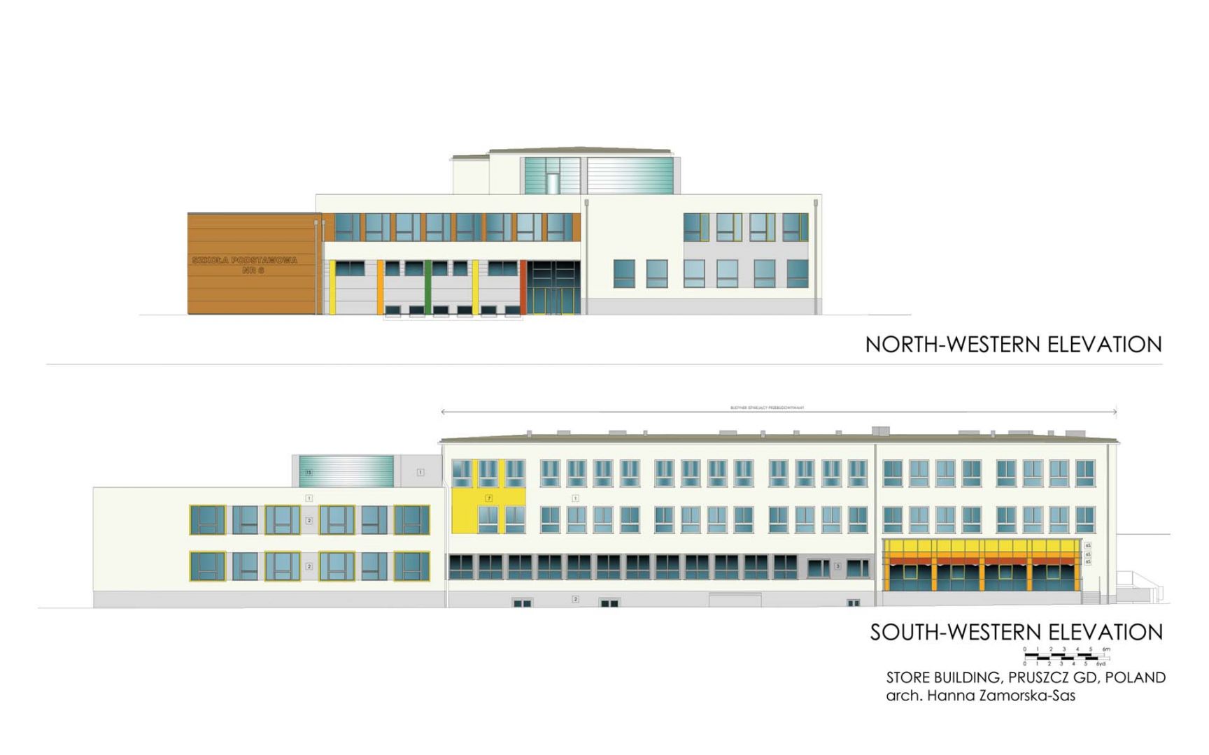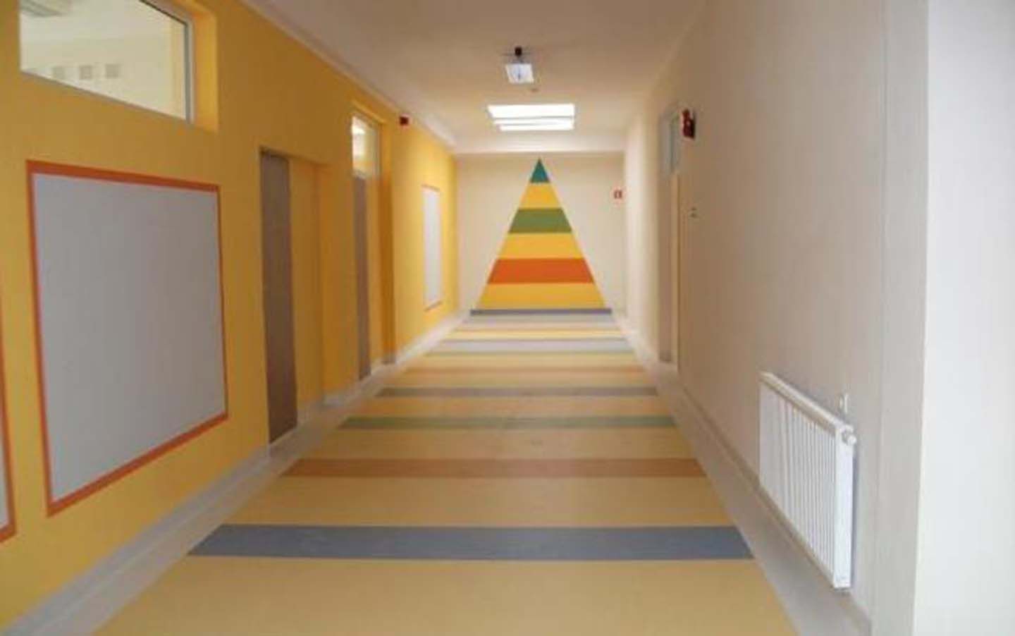 The extension design was intended to create a clear functional layout with a division into teaching and sports zones. The existing main entrance to the building has retained its function, leading to the primary didactic part of the school, extended by a set of new classrooms designed for the youngest pupils, right next to the administrative part of the school. From here, children can go out to a recreational area designed just for them.