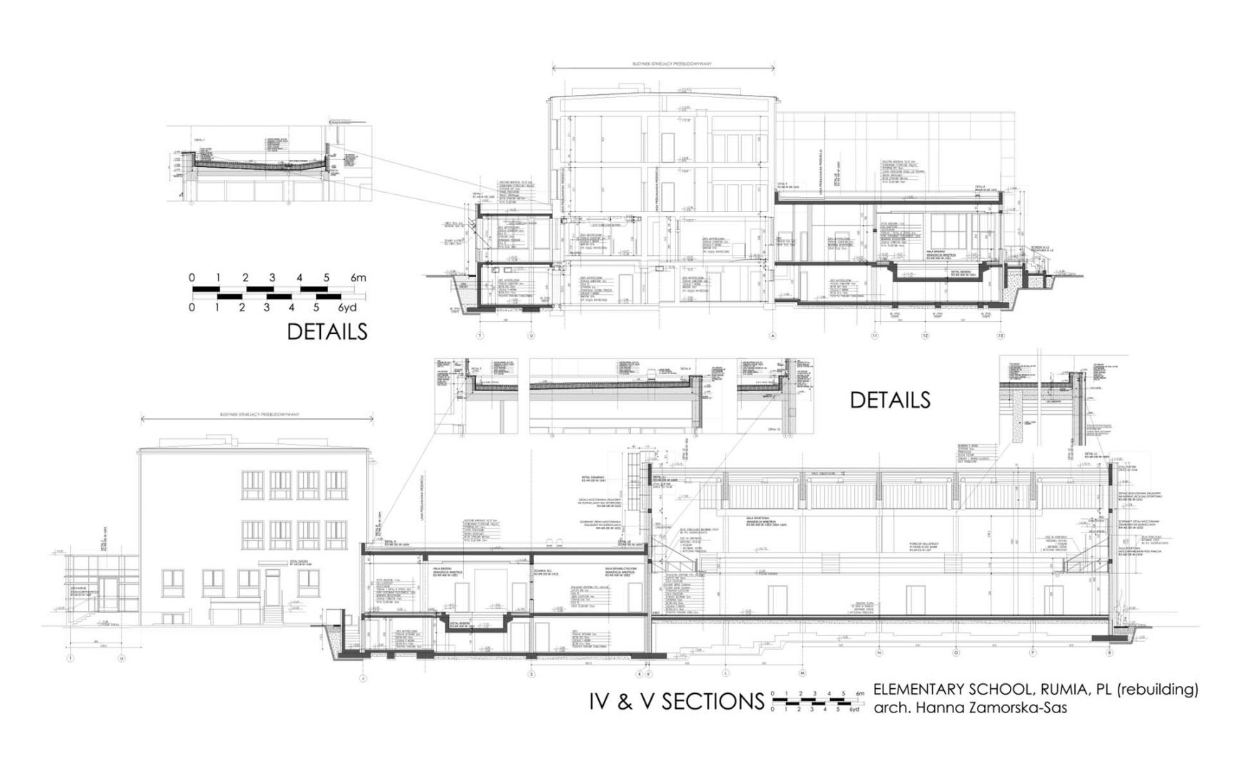 The transition to the new sports complex was designed from the ground floor level as the most natural. A small swimming pool and a gym for up to 12 people can be accessed directly from the locker room and sanitary facilities. A separate zone is the sports hall block with an independent complex of locker rooms and toilets. The auditorium of the sports hall is located on the mezzanine above the changing rooms. The layout of the building allows for separate functioning of the gym block, swimming pool, and rehabilitation office – the project assumes access to them also directly from outside. After entering the sports block, students can go directly to the locker rooms of the pool or sports halls. The designed complex is fully accessible for people with disabilities. At the basement level, technical rooms are to serve as a ventilator room and a place for water treatment installation for the swimming pool.
