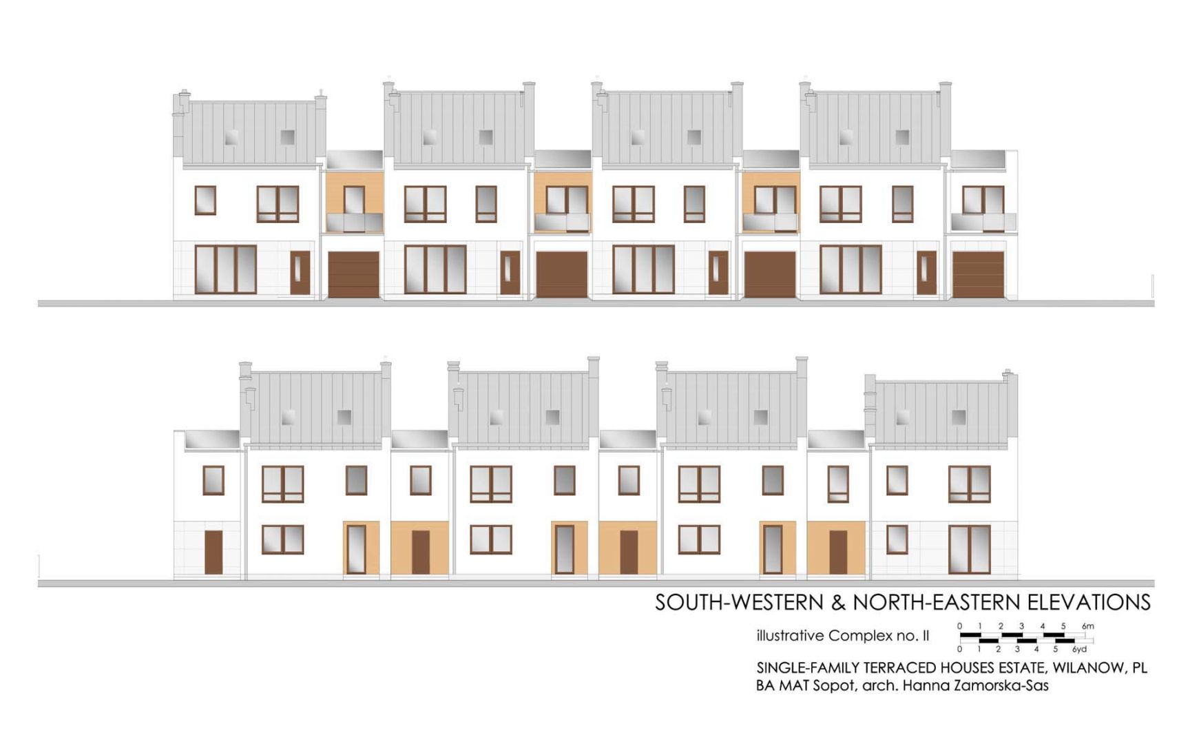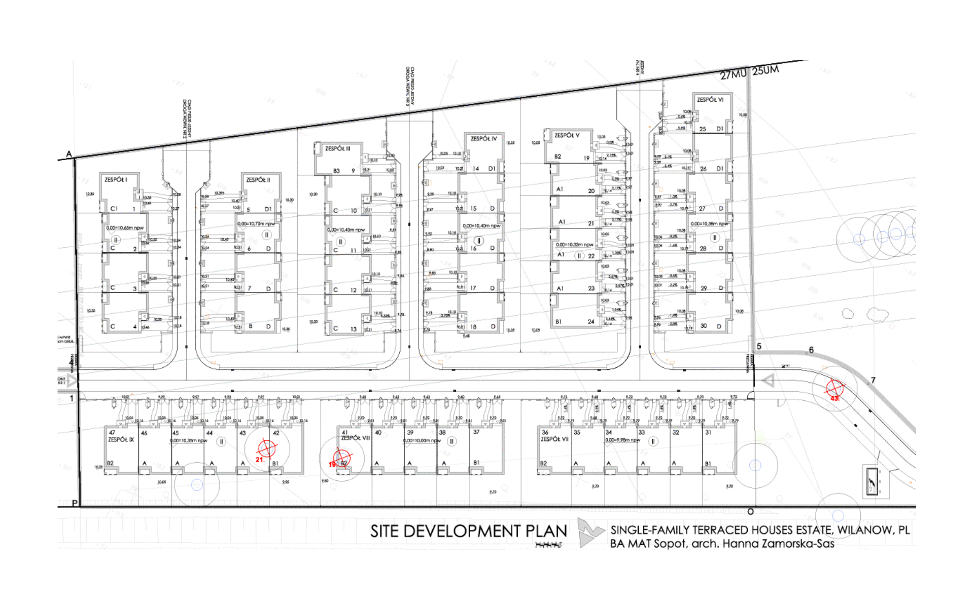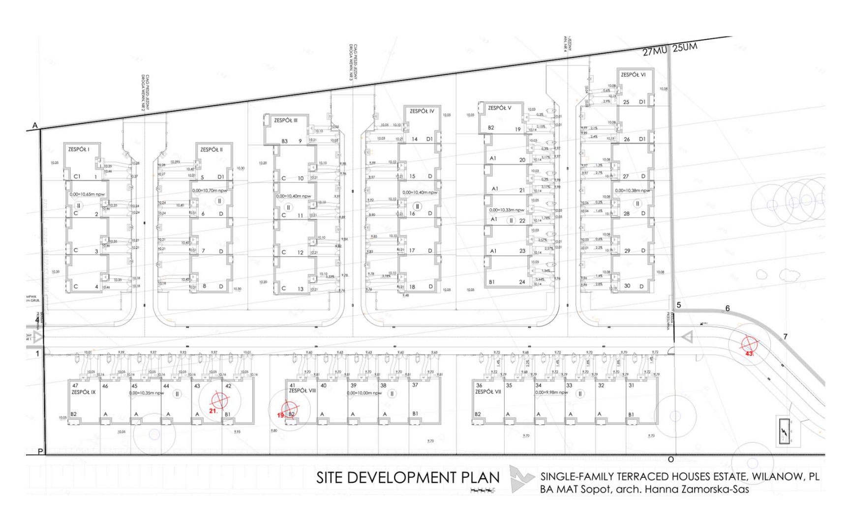 The main axis of the estate is the internal roads along which, on the southern side, three complexes of terraced houses have been designed. From this road, three pedestrian areas and roadways diverge in the northerly direction ending with a plaza for car turning. Along with them, two residential complexes were located on each side.