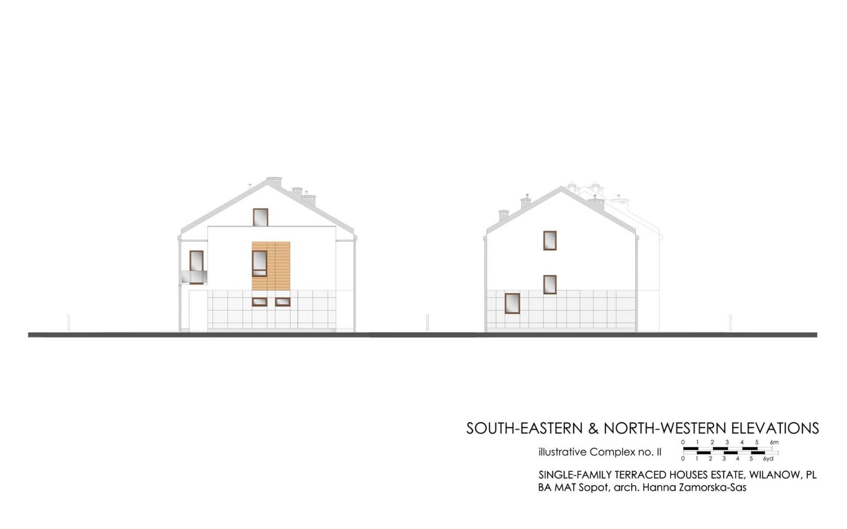 Each of the segments of terraced housing is non-basement, two-story (ground and first floor) with an attic in the space under the gable roof. Roof slope inclination – 30°.
